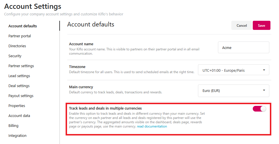 The main account’s currency converts all currency fields into the same currency to easily compare partners, deals, transactions, and much more.