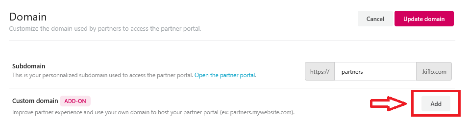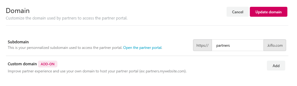 If you want to hide Kiflo from your partners, so they only see your brand/name when accessing their portal, you can purchase the custom domain add-on (see pricing on our website).