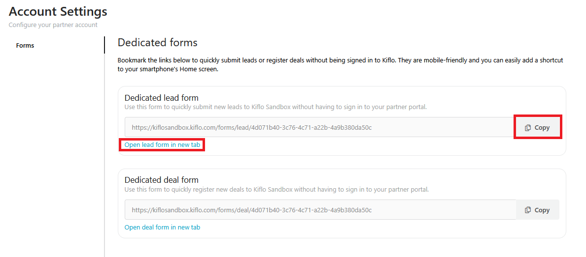 Click the Copy button or Open lead form in new tab link to access the standalone page.