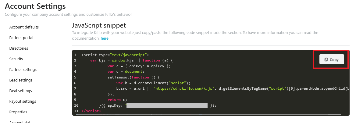 - Copy the JavaScript snippet displayed on the page. It is already customized with your own "apiKey":