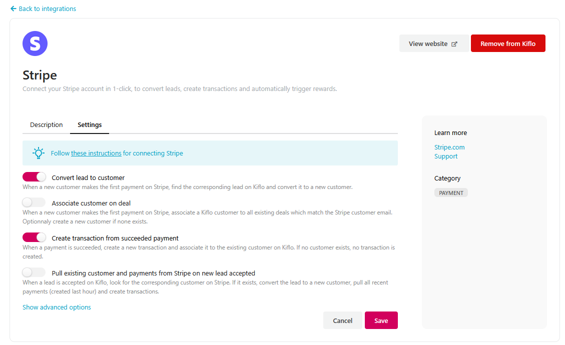 If you register the lead in Kiflo after it is converted in Stripe, you need Kiflo to pull existing data from Stripe.
