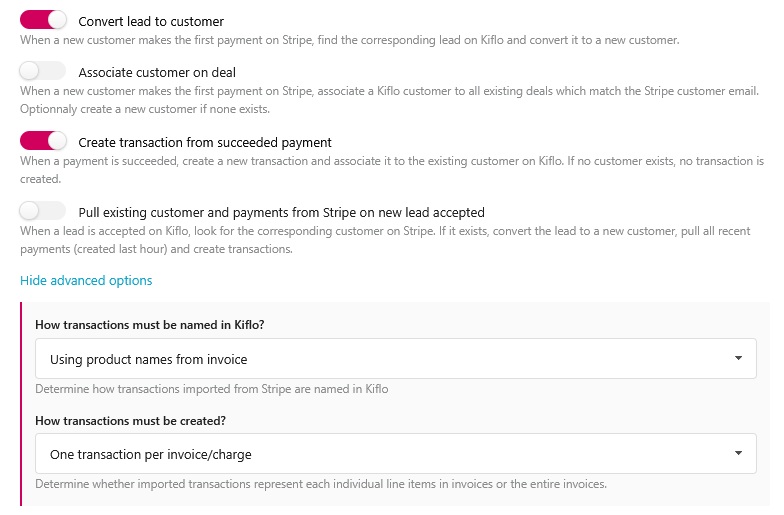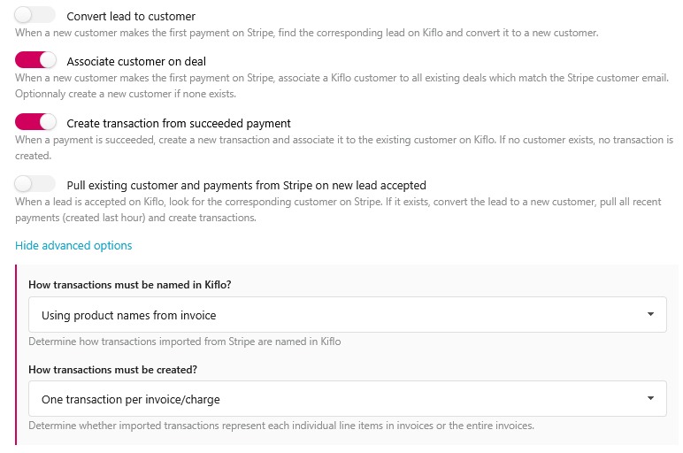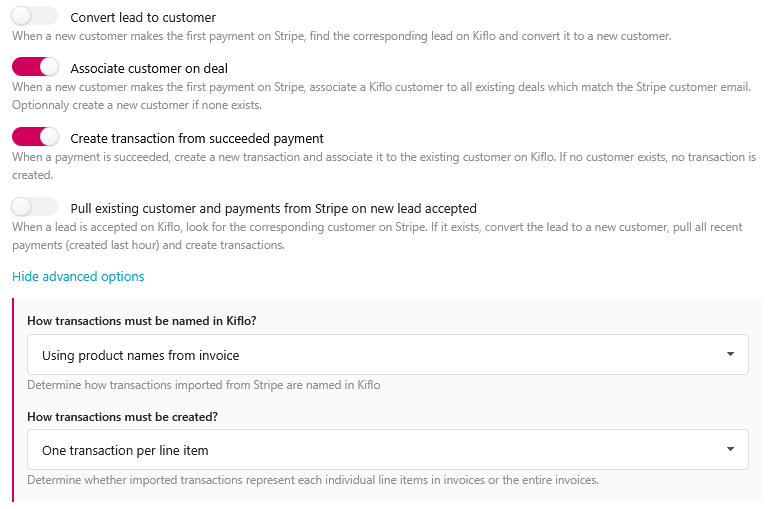 Turn this option on to create new transactions in Kiflo when you get new successful payments from Stripe.